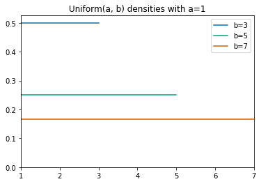 $$ E(X) = \int_{-\infty}^\infty \, x\, f_X(x) \, dx $$(Continuous) Uniform distributions are used to model situations is which every value in an interval is "equally likely" in the sense of having the same density. The density of a Uniform distribution with parameters $a$ and $b$ is constant on the interval $(a, b)$ and is specified by the probability density function