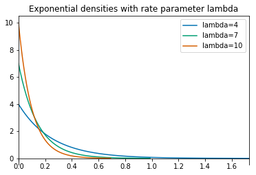 $$ f(x) = \lambda e^{-\lambda x}, \quad x>0. $$Exponential distributions can be parametrized in terms of the rate parameter $\lambda$ (using rate=) or the scale parameter $1/\lambda$ (using scale=).