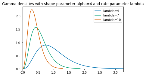plt.title("Gamma densities with shape parameter alpha=4 and rate parameter lambda");
