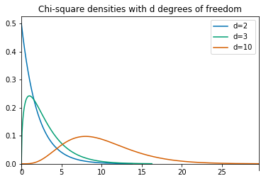 $$ \begin{align*} E(X) & = d \\ Var(X) & = 2d \end{align*} $$Example. Actual and simulated pdf for ChiSquare(df=2).