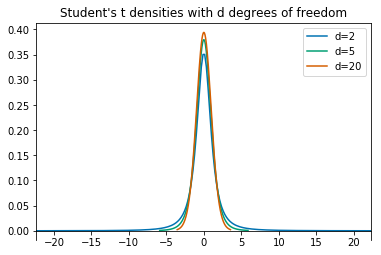 A (Student's) t (StudentT) distribution with d degrees of freedom has the probability density function