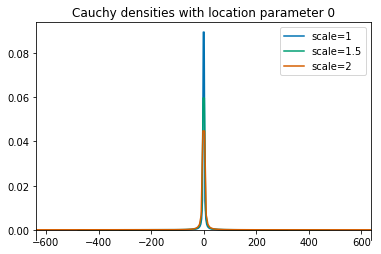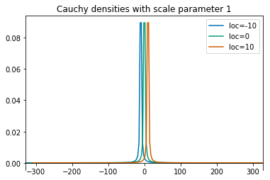$$ f(x) = \frac{1}{\pi\gamma} \frac{1}{1 + \left(\frac{x - x_0}{\gamma}\right)^2} $$If $X$ is a random variable with a Cauchy($x_0,\,\gamma$) distribution then $$ \begin{align*} E(X) & \text{ is undefined} \\ Var(X) & \text{ is undefined} \end{align*} $$
