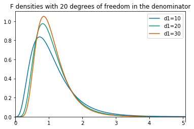 plt.title("F densities with 20 degrees of freedom in the denominator");