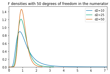 plt.title("F densities with 50 degrees of freedom in the numerator");