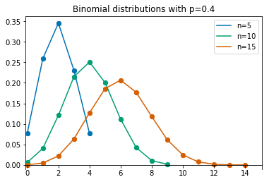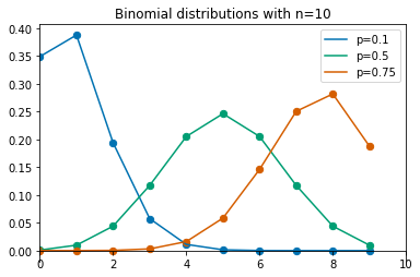 Binomial distributions are often used to model the number of successes observed in a fixed number (n) of Bernoulli(p) trials (independent, success/failure trials, with probability of success p on each trial). A Binomial distribution with parameters n (a nonnegative integer) and p (in [0,1]) is specified by the probability mass function