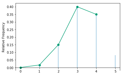 $$ E(X) = \sum_x x\, p_X(x) = \sum_x x P(X=x) $$A discrete distribution can be specified via a BoxModel where the tickets represent possible values (i.e. the values with non-zero probability) and the probs option specifies the probabilities.