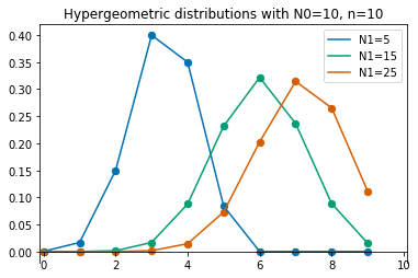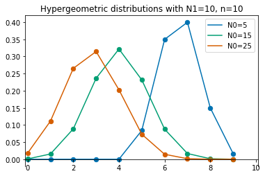 plt.title("Hypergeometric distributions with N0=10, n=10")