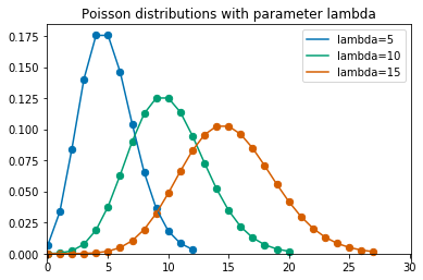 A Poisson distribution with parameter $\lambda>0$ is specified by the probability mass function $$ \frac{e^{-\lambda} \lambda^x}{x!}, \quad x = 0, 1, 2, \ldots $$ If $X$ is a random variable with a Poisson($\lambda$) distribution then $$ \begin{align*} E(X) & = \lambda \\ Var(X) & = \lambda \end{align*} $$