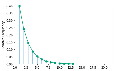 Example. Actual and simulated pmf for Geometric(p=0.4).