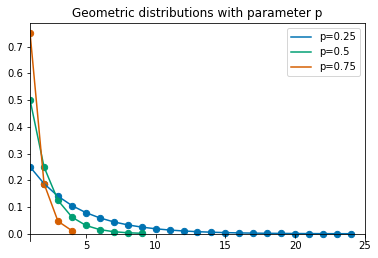 Geometric distributions are often used to model the number of Bernoulli($p$) (independent, success/failure) trials needed to achieve the first success. A geometric distribution with parameter p (in [0,1]) is specified by the probability mass function