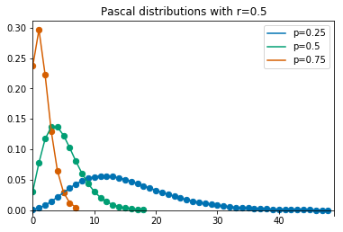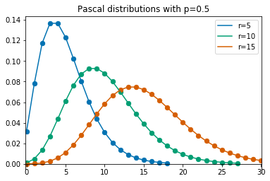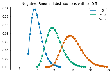 Example. NegativeBinomial(r, p=0.5) pmf.