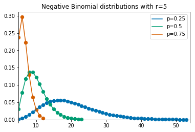 Negative binomial distributions are often used to model the number of Bernoulli($p$) (independent, success/failure) trials needed to achieve a specified number of successes ($r$). A negative binomial distribution with parameters $p$ and $r$ is specified by the probability mass function $$ \binom{x-1}{r-1}p^r(1-p)^{x-r}, \quad x = r, r+1, r+2,\ldots $$ If $X$ is a random variable with a NegativeBinomial($r, p$) distribution then $$ \begin{align*} E(X) & = \frac{r}{p} \\ Var(X) & = \frac{r(1 - p)}{p^2} \end{align*} $$