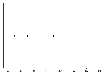 Example. Rug plot of 50 simulated values of a random variable with a Poisson(10) distribution.
