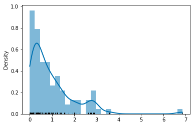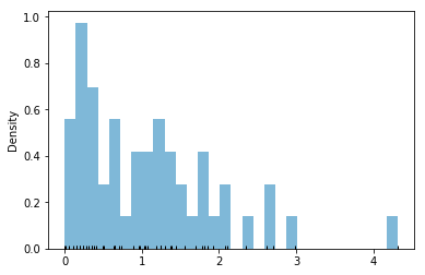 Example. Histogram of 50 simulated values of a random variable with an Exponential distribution, with the individual values displayed in a "rug" along the horizontal axis.
