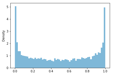 RV(Beta(a=0.5, b=0.5)).sim(10000).plot(bins=60)