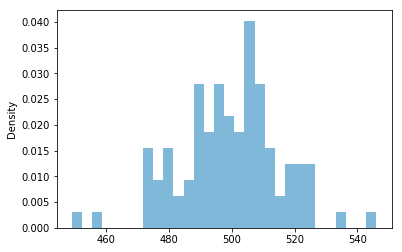 RV(Binomial(n=1000, p=0.5)).sim(100).plot()