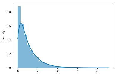 Example. Histogram and density plot of simulated values of a random variable with an Exponential distribution with rate 1.