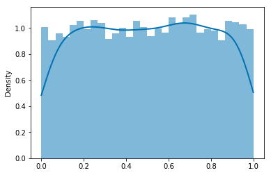 Example. Histogram and density plot of simulated values of a random variable with a Uniform distribution on (0, 1). Notice that the estimated density loses accuracy near the boundaries 0 and 1.