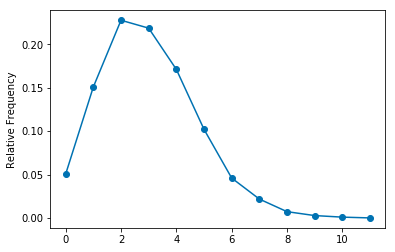 RV(Binomial(10, 0.1)).sim(10000).plot()