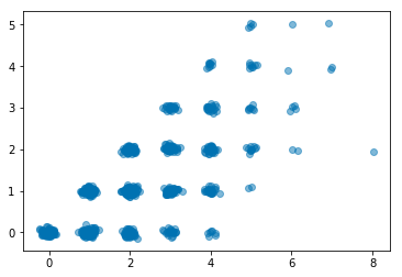 For discrete random variables it is recommended to use the jitter=True option to better visualize coincident points.
