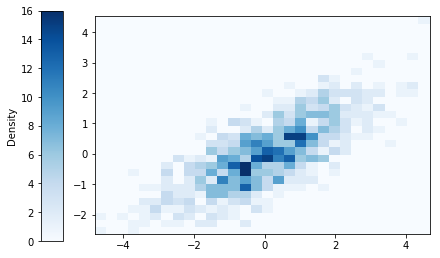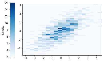 The continuous analog of a tile plot is a two-dimensional histogram. For two continuous random variables, plot type hist produces a plot in which simulated pairs are placed into rectangular bins, and the density of each bin is visualized using a color scale.