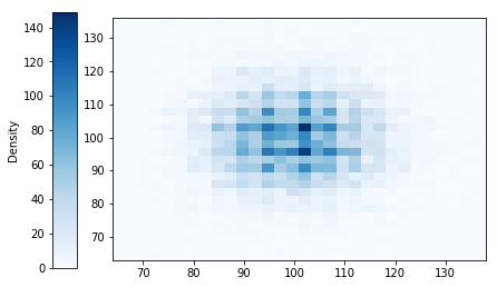 The number of bins can be controlled with the bins argument, which can take a list of two values, one for each of the $x$ and $y$ variables.