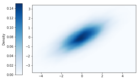 For two continuous random variables, plot type density uses the simulated $(x, y)$ to estimate the joint probability density function and plot it.
