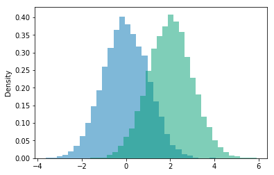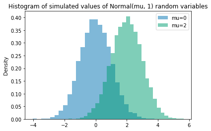 Example. Histograms comparing two sets of simulated values. Notice the plot title and legend.