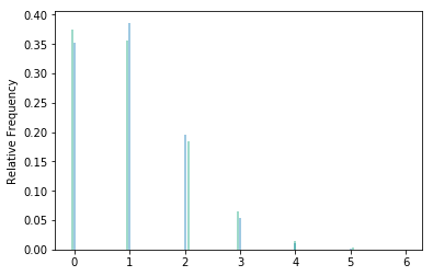 Example. Comparison of simulated values from a Binomial(10, 0.1) distribution and from a Poisson(1) distribution.