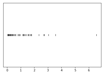 Example. Rug plot of 50 simulated values of a random variable with an Exponential(1) distribution.