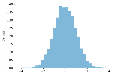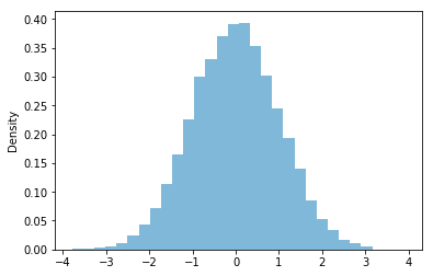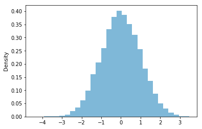 Calling .plot() for simulated (X, Y) pairs produces a scatterplot summary of the simulated values. When the variables are discrete, it is recommended to use the jitter=True option to better visualize relative frequencies. The alpha= parameter controls the level of transparency.