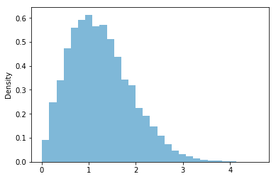 Example. The coordinates of a "random point" in the $(x, y)$ plane are random variables $X$ and $Y$ chosen independently of each other, each according to a Normal(0, 1) distribution. Produce a plot of the approximate distribution of $Z$, the distance of the $X, Y$ point from the origin.